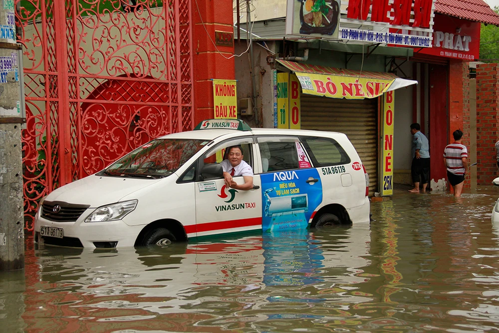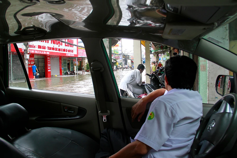 Nước dâng cao từ chiều 25-11 trên đường Phan Huy Ích khiến tài xế Nguyễn Văn Khôi lái xe taxi Vinasun chỉ kịp tấp lên lề đường. Xe chết máy khiến ông phải trả khách và nằm chờ nước rút. "Từ hôm qua đến giờ tôi chưa ăn uống và nói xin lỗi là muốn đi vệ sinh nhưng cũng chưa đi được" - ông Khôi thật tình.