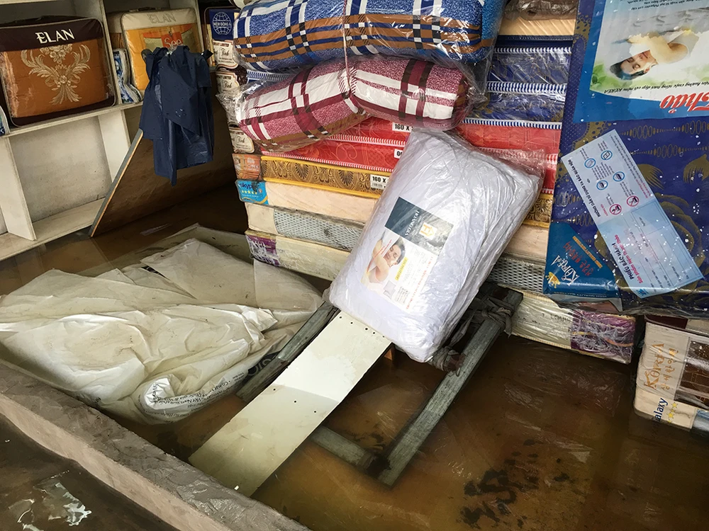 Nước tràn vào nhà một người dân kinh doanh nệm ven đường, thiệt hại số tài sản lớn.