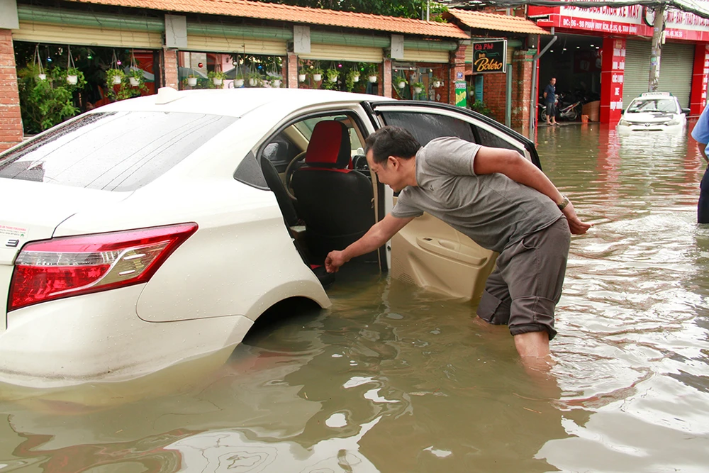 Hàng loạt xô tô bị chết máy nằm la liệt trên đường. "Chờ hoài nước không rút nên chúng tôi phải di chuyển phương tiện đến nơi cao ráo hơn để chờ phương tiện cứu hộ đến di chuyển" - một chủ phương tiện cho hay.