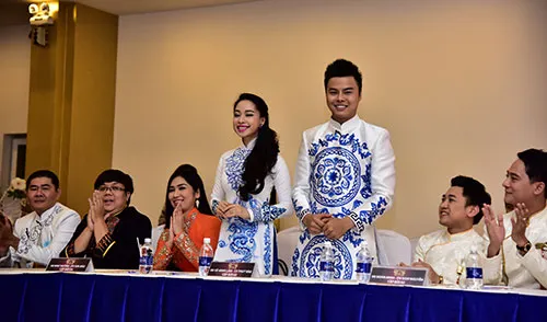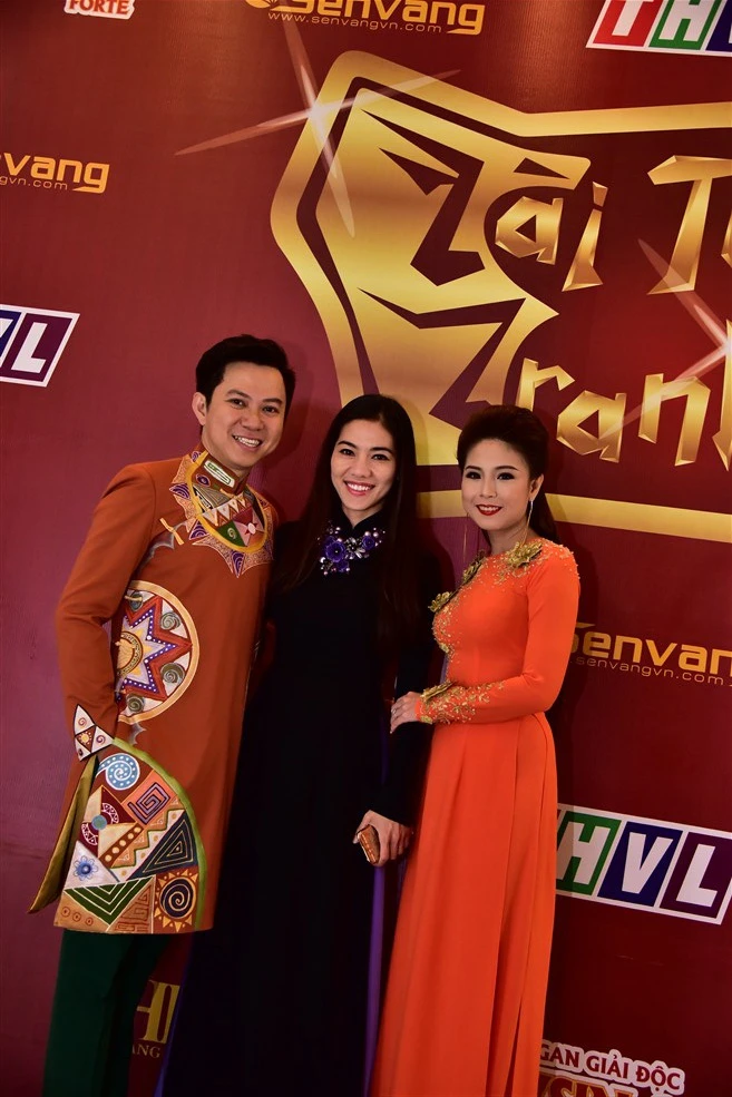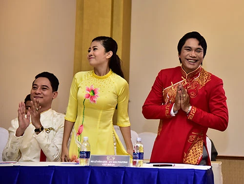 Cặp đôi thí sinh ca sĩ Quốc Đại và nghệ sĩ cải lương Thy Trang cùng trưởng ban tổ chức cuộc thi.