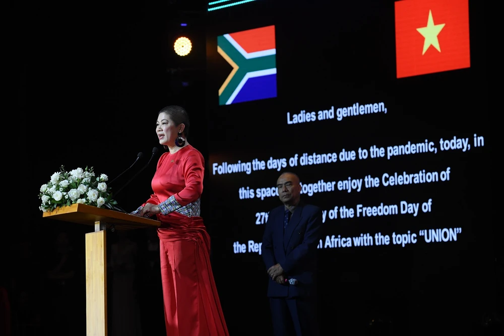 Bà Đỗ Thị Kim Liên phát biểu tại lễ kỉ niệm 27 năm Quốc khánh Cộng hòa Nam Phi. Ảnh: MINH HỒNG