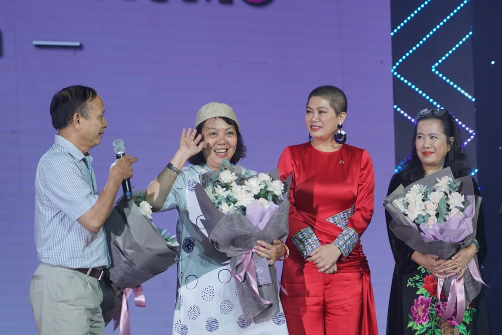Bà Đỗ Thị Kim Liên tặng hoa cảm ơn các nhà văn đã chắp bút cuốn sách về bà. Ảnh: MINH HỒNG