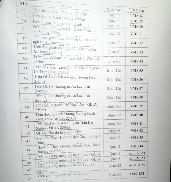 Danh sách các điểm có bản tin môi trường xuất hiện trên bản tin giao thông điện tử. Ảnh: TRUNG THANH