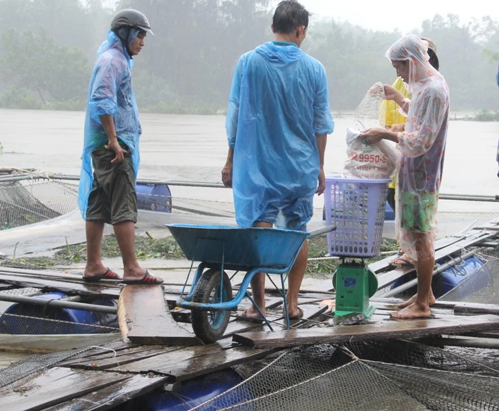 Không chỉ hộ anh Trung, nhiều hộ khác ở đây cũng lâm vào cảnh tương tự. Riêng ở xã Tam Xuân 1 (huyện Núi Thành), gia đình ông Lực bị thiệt hại nghiêm trọng. Nước dâng quá nhanh khiến cá trong 20 lồng của ông chết gần hết. Không còn cách nào khác, trong ngày hôm nay ông vớt cá ra bán giá rẻ cho lái buôn.