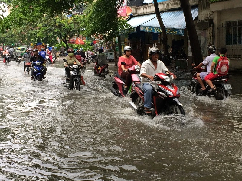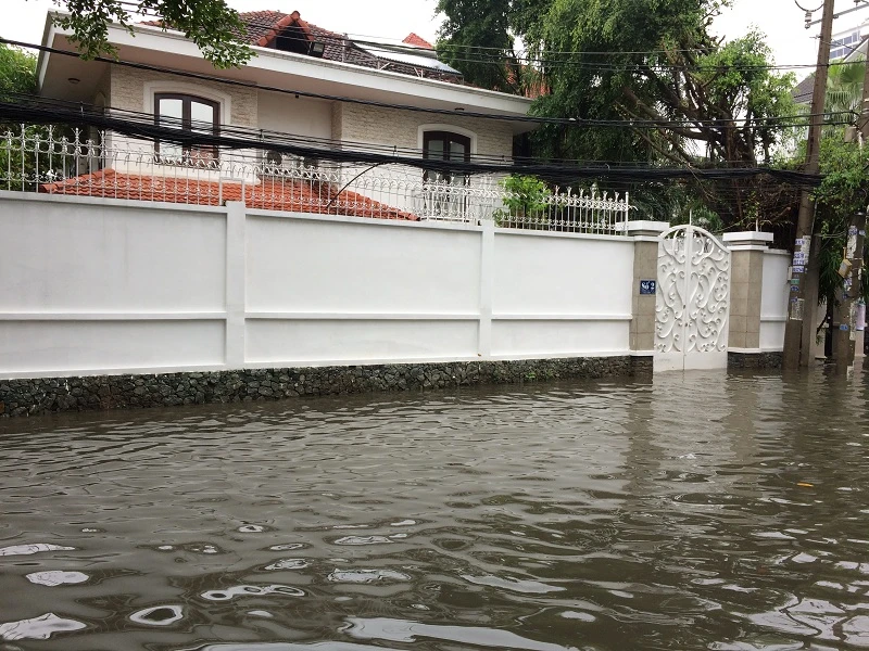 Sáng 2-6, khu vực phường Thảo Điền (quận 2, TP.HCM) nhiều nơi bị ngập. Tại tuyến đường Quốc Hương, có những khu vực ngập sâu gần nửa mét, đây là một trong những rốn ngập của TP.HCM, mưa to, nhỏ thì tuyến đường này đều hay ngập.