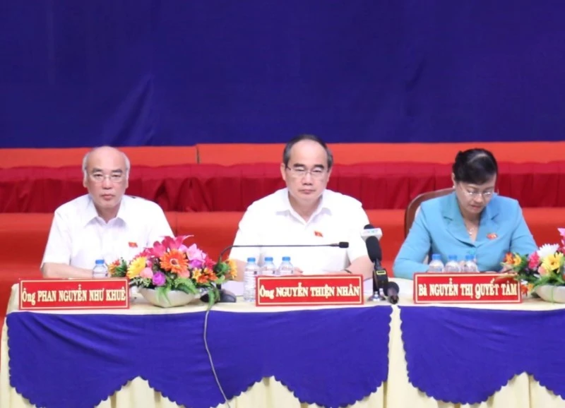 Bí thư Nguyễn Thiện Nhân cùng các đại biểu Quốc hội lắng nghe ý kiến cử tri. Ảnh: TÁ LÂM