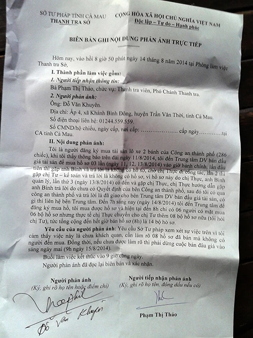 Việc bán hồ sơ chỉ được thực hiện trong 30 phút sáng ngày 14/8, từ 7 giờ 30 đến 8 giờ. Tố cáo của ông được Thanh tra Sở Tư Pháp Cà Mau ghi nhận cùng ngày, bằng văn bản. Theo đó, ông Khuyên yêu cầu của ông phải làm rõ dấu hiệu bưng bít hồ sơ bán đấu giá của bà Thực và ông Bình. Lô xe đưa ra bán lần này gồm 286 chiếc xe gắn máy, giá khởi điểm 128,7 triệu đồng.