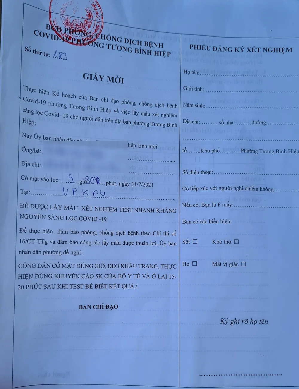 Theo bà NTKO, sáng nay đại diện của khu phố đến từng nhà để phát phiếu đăng ký test COVID-19 cho người dân theo chủ trương của thành phố.