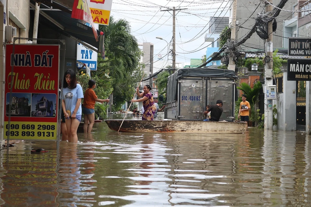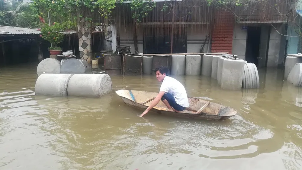 Sau cơn mưa kéo dài nhiều giờ đồng hồ ngày 25 và sáng 26-11, người dân ở đường số 7 và đường số 9 (khu phố 5, phường Hiệp Bình Phước, quận Thủ Đức, TP.HCM) phải dùng xuồng để di chuyển mua đồ ăn, nước uống.