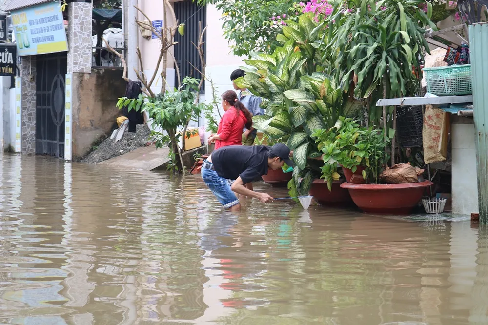 Ngoài đường, nhiều gia đình vẫn đang di chuyển từng vật dụng trong nhà ra để bỏ tạm ở những nhà ngoài mặt đường, chỗ ít nước hơn. Còn đám trẻ nhỏ thì hào hứng vác vợt đi bắt cá hoặc ngồi phao nhờ bạn đẩy chơi.