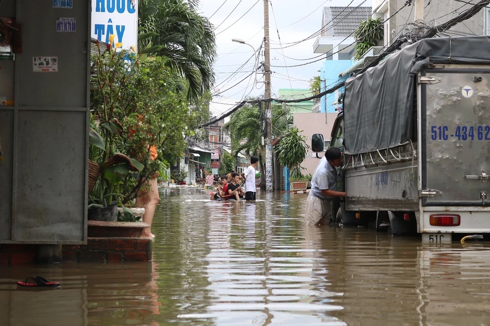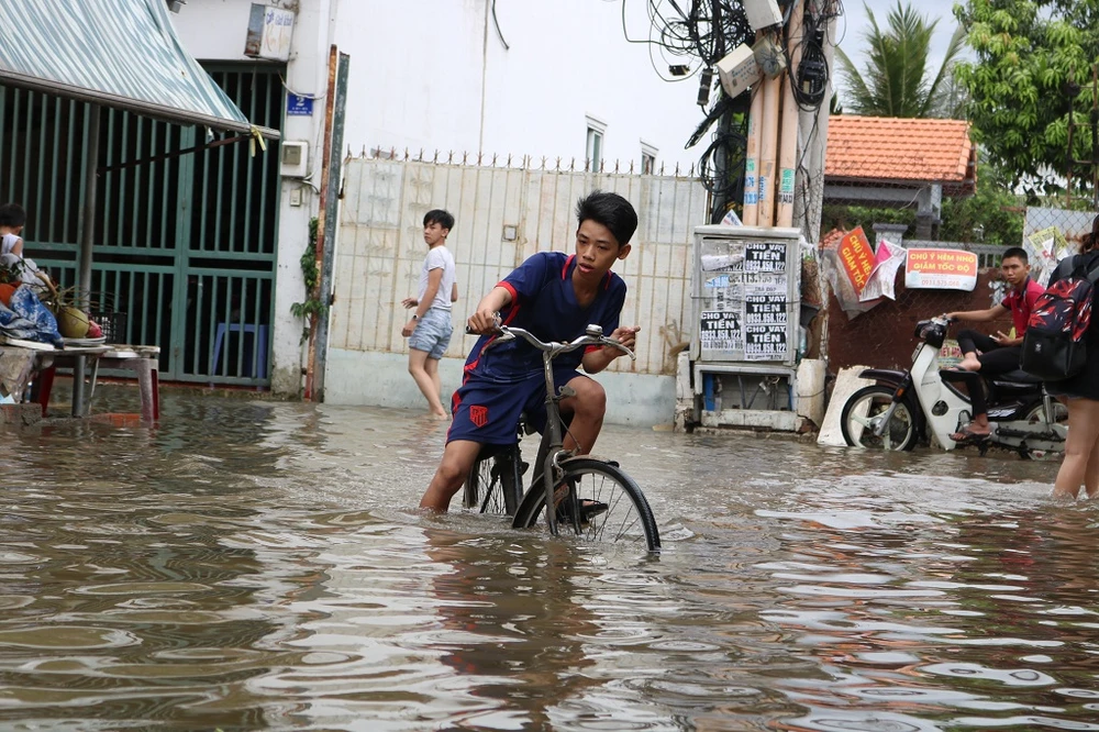 Con đường số 7 nối liền đường số 9, khu phố 5, phường Hiệp Bình Phước, quận Thủ Đức, TP.HCM ngập nước. Ảnh: T.TUYỀN