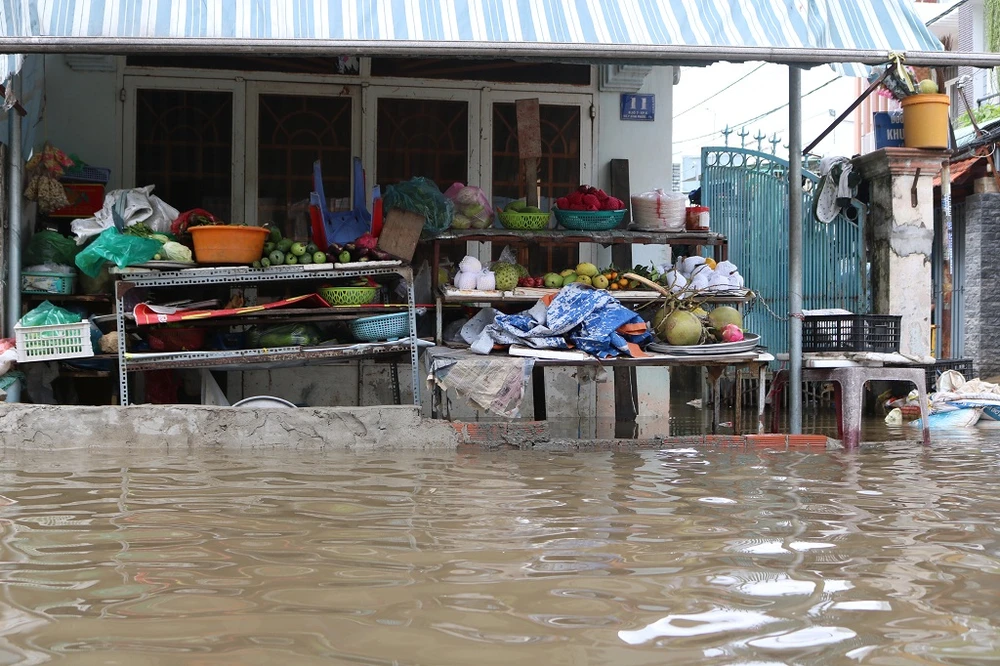 Một sạp bán rau củ, trái cây và đồ ăn đầu con hẻm là cứu cánh của nhiều hộ gia đình ở sâu trong hẻm vì đường ngập không thể đi xa. Ảnh: T.TUYỀN