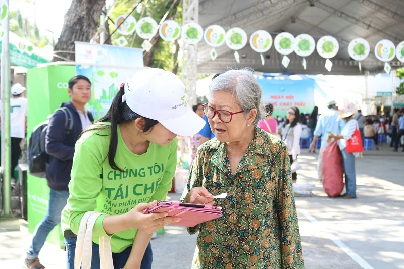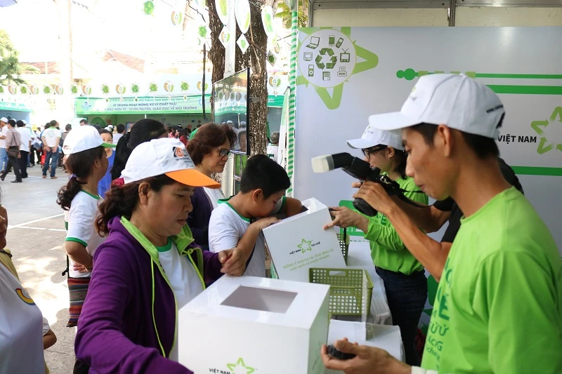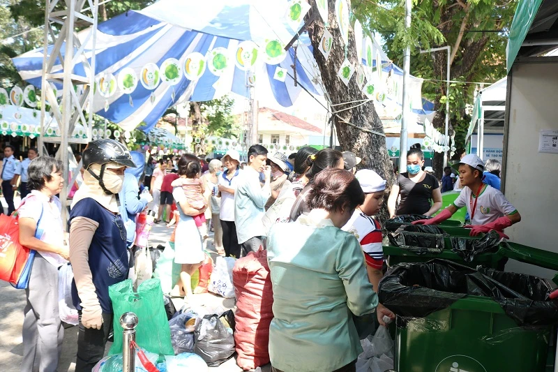 Khu vực "Đổi chất thải nguy hại hội gia đình" lúc nào cũng tấp nập người đến.
