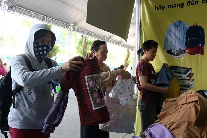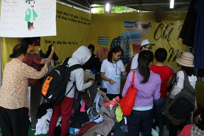 Người dân mang áo quần, giày dép cũ đến với gian hàng "Cũ người mới ta", cũng có người đến mua lại với giá rẻ.