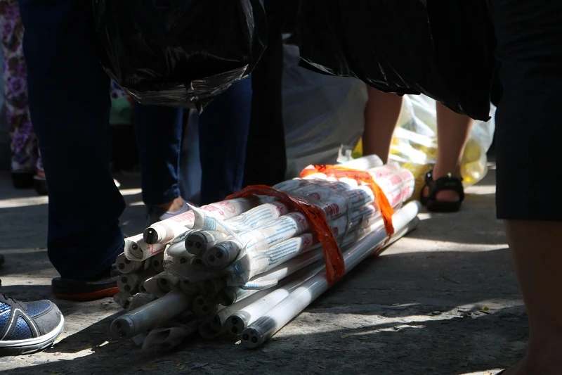 Những tuýp bóng đèn dài đã qua sử dụng được người dân bó chặt cẩn thận mang đến để đổi.