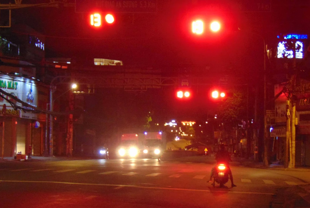 Thi thoảng xuất hiện xe chở hàng hóa thiết yếu hoặc đưa lực lượng phòng, chống dịch COVID-19 đi làm nhiệm vụ. Lâu lâu cũng có vài xe gắn máy của các anh công nhân vệ sinh môi trường đô thị trên đường về nhà sau giờ tan ca.