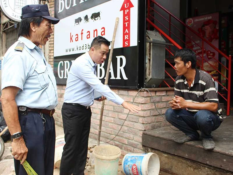Ông Cao Hồng Việt, Phó Chủ tịch UBND phường Phạm Ngũ Lão, quận 1, TP.HCM, vận động một hộ kinh doanh tự phá dỡ bậc tam cấp trên đường Phạm Ngũ Lão. Ảnh: LÊ THOA