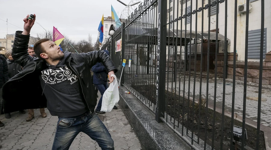 Dân Ukraine tấn công đại sứ quán Nga ở Ukraine ngày 6-3. (Ảnh: RT)