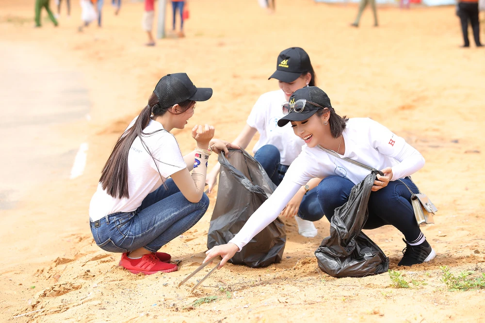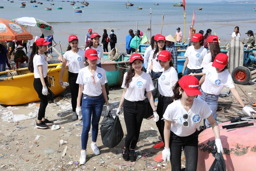 Các người đẹp hào hứng tham gia hoạt động nhặt rác tại làng chài Mũi Né.