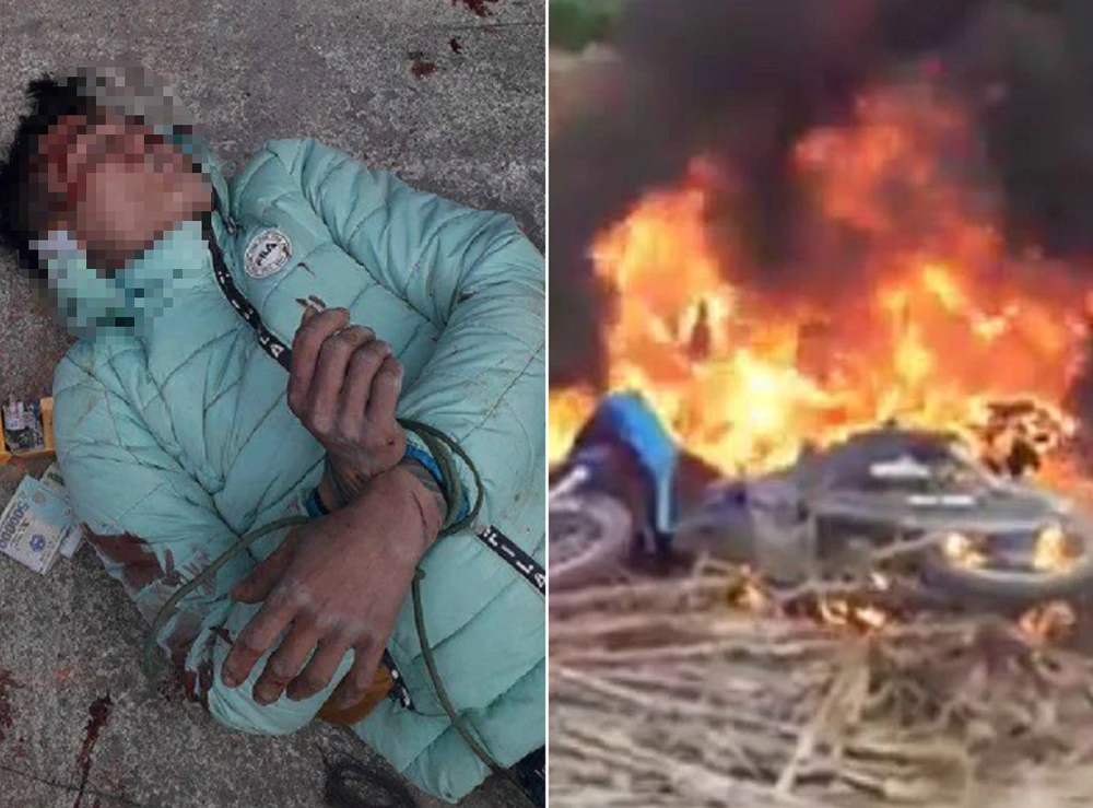 Nam thanh niên bị đánh ngất xỉu rồi đốt xe. Ảnh: FB