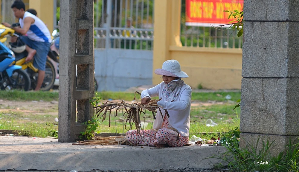Hình ảnh người phụ nữ ngồi đón con tan học, tranh thủ ngồi bệt xuống vỉa hè đan giỏ lục bình kiếm thêm thu nhập... ẢNH: NVCC.