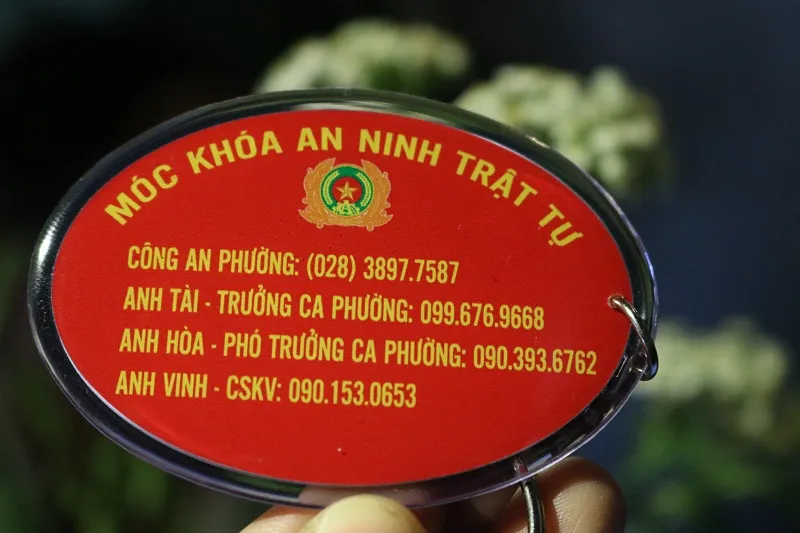 Chiếc móc khóa có ghi số điện thoại của công an phường để người dân liên hệ khi cần. Ảnh: THANH TUYỀN