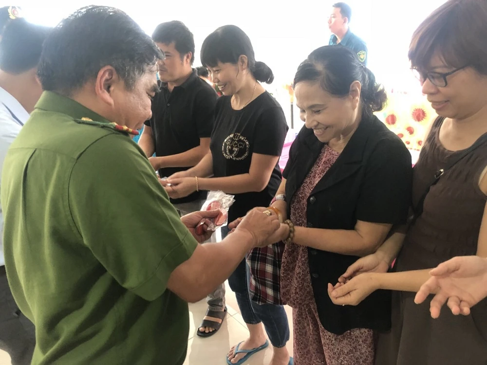 Trung tá Nguyễn Văn Tài phát móc khóa cho người dân. Ảnh: TT