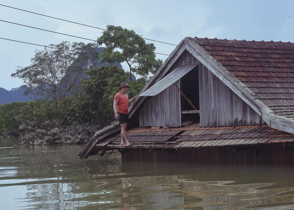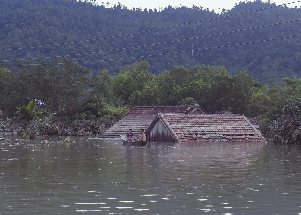 Chiều hôm nay, tại Tân Hóa vẫn có 650 ngôi nhà bị ngập. Trong đó có 40 ngôi nhà vẫn ngập tới nóc. Ảnh: N.DO