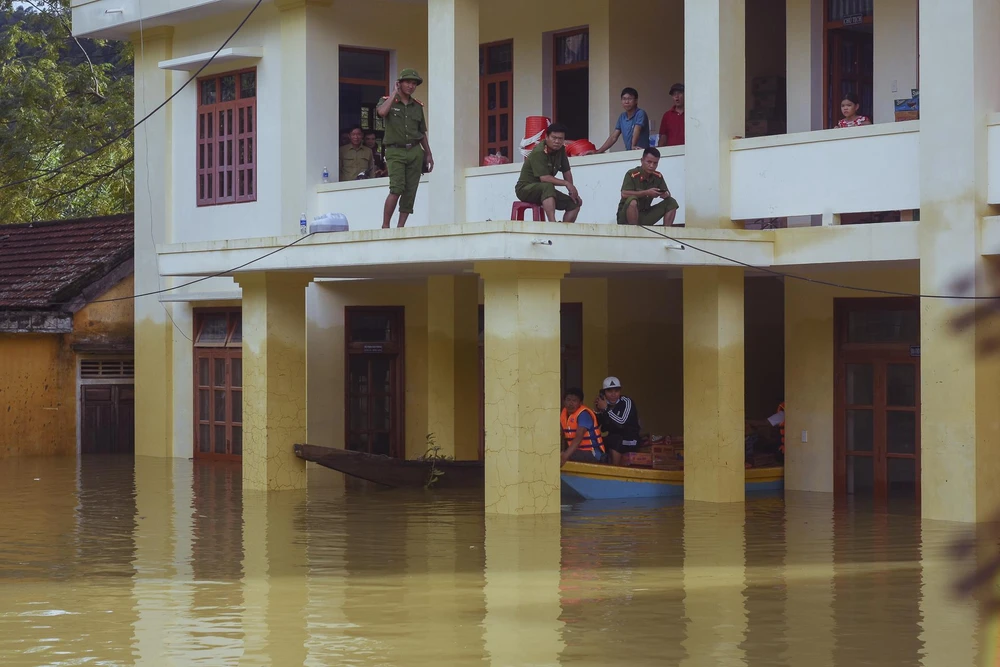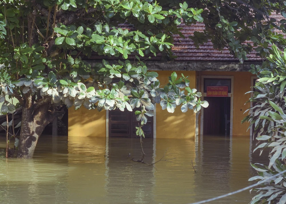 UBND xã Tân Hóa, nước rút hơn 2m nhưng vẫn còn ngập sâu. Tại sân ủy ban xã nước cao khoảng 2m. Ảnh: N.DO