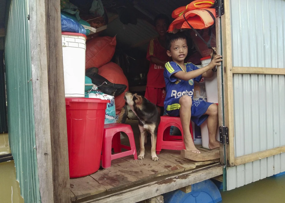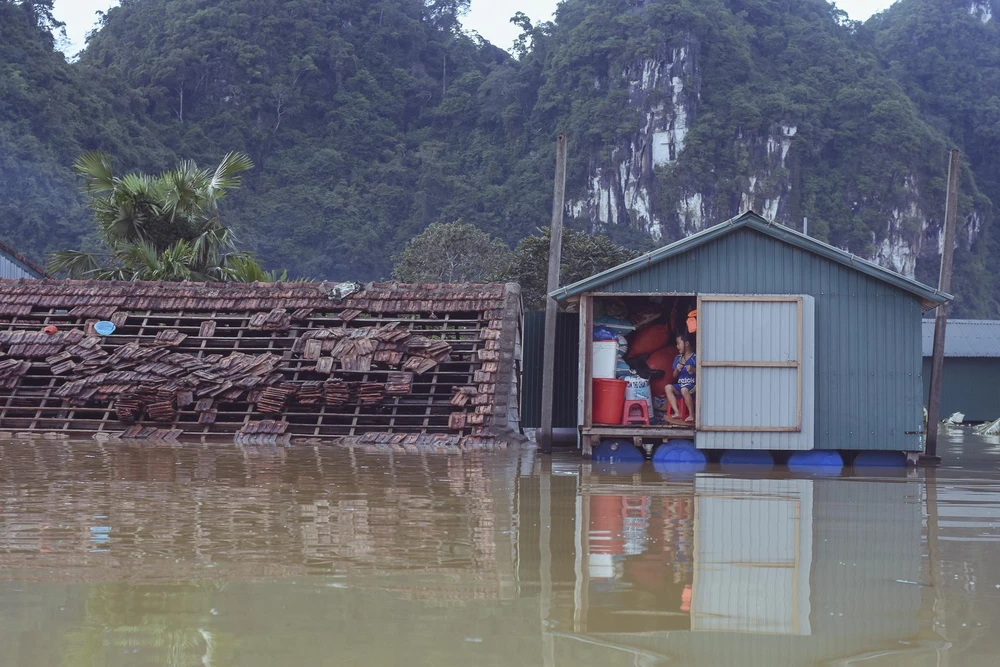 Một em nhỏ trong vùng lũ đứng nhìn ra dòng nước trước nhà. Ảnh: N.Do