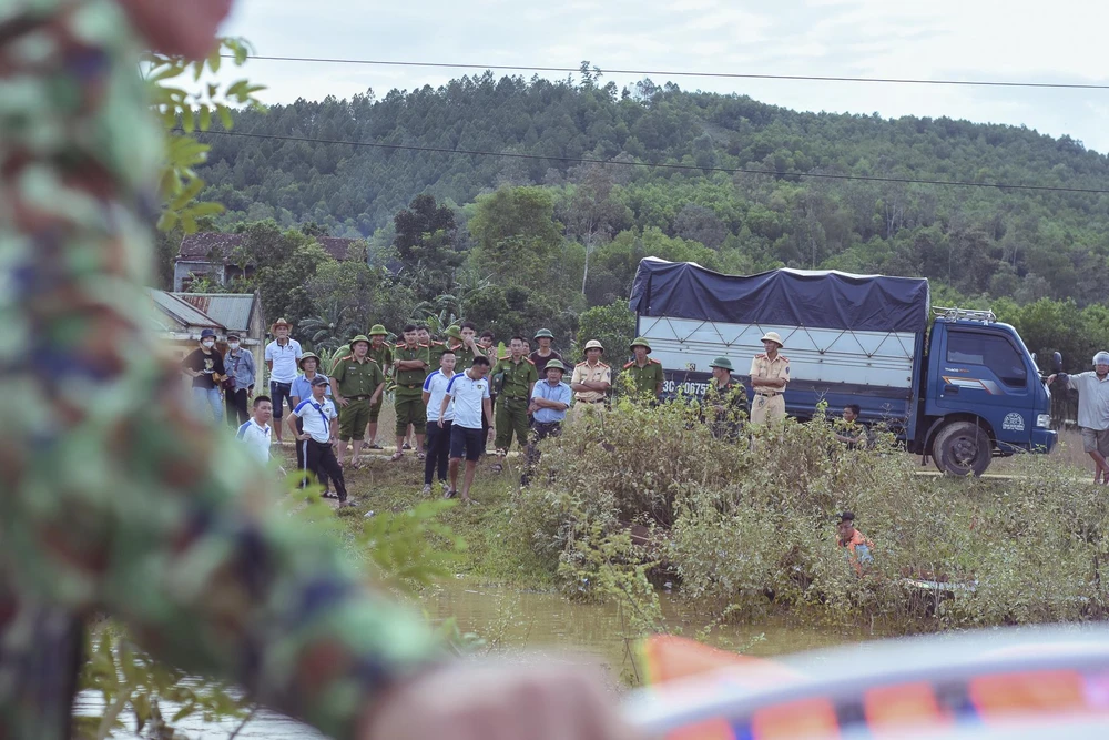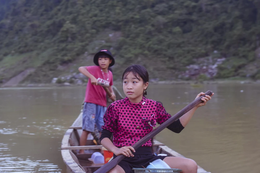 Hai em nhỏ trong dòng nước lũ sâu khoảng 6 đến 9 mét. Ảnh: N.DO