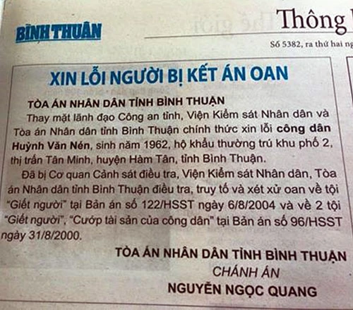 Nội dung thông báo Xin lỗi người bị kết án oan nêu rõ: “TAND tỉnh Bình Thuận thay mặt lãnh đạo Công an tỉnh, VKSND và TAND tỉnh Bình Thuận chính thức xin lỗi công dân Huỳnh Văn Nén, sinh năm 1962, hộ khẩu thường trú khu phố 2, thị trấn Tân Minh, huyện Hàm Tân, tỉnh Bình Thuận đã bị Cơ quan CSĐT, VKSND, TAND tỉnh Bình Thuận điều tra, truy tố, xét xử oan về tội giết người tại Bản án số 122/HSST ngày 6-8-2004 (kết án năm năm vụ “Vườn điều” - PV) và về hai tội giết người, cướp tài sản của công dân tại Bản án số 96/HSST ngày 31-8-2000 (bị kết án chung thân - PV). Thay mặt TAND tỉnh Bình Thuận, Chánh án Nguyễn Ngọc Quang”.