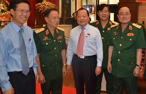 Bí thư Thành ủy TP.HCM Lê Thanh Hải (thứ ba từ phải qua) trao đổi với các đại biểu tại Đại hội đại biểu Đảng bộ Quân sự TP.HCM lần thứ XI. Ảnh: TÁ LÂM