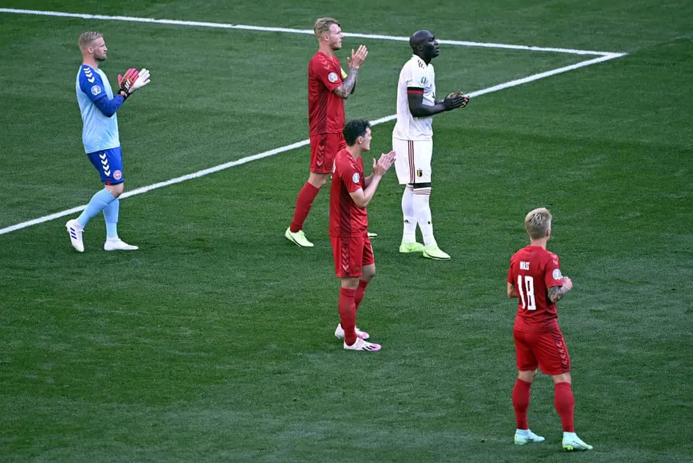 Cả hai đội cùng dừng lại ở phút thứ 10 để động viên ngôi sao Eriksen. Ảnh: Shutterstock.