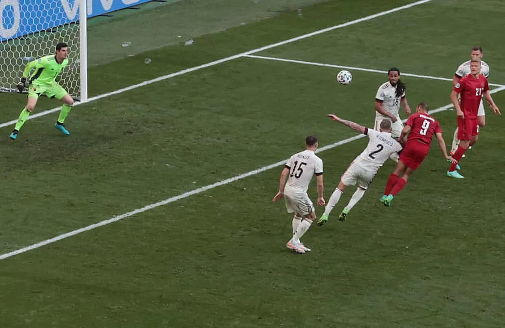 Sau khi có bàn thắng, Đan Mạch thi đấu hưng phấn và có nhiều pha bóng gây sóng gió cho khung thành tuyển Bỉ. Phút 16, tiền đạo Braithwaite của Đan Mạch có tình huống đánh đầu cận thành, nhưng bóng lại đập đất đi ra ngoài.