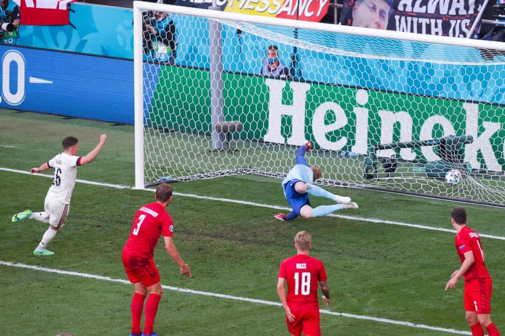 Từ tình huống dốc bóng tốc độ rồi xâm nhập vòng cấm bên cánh phải của Lukaku, bóng đến chân De Bruyne và tiền vệ này bình tĩnh loại bỏ hàng thủ của Đan Mạch, để cho Thorgan Hazard dứt điểm cận thành đánh bại thủ môn Schmeichel.