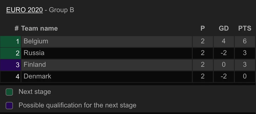 Ngược lại, Đan Mạch sau hai trận thua liên tiếp buộc phải quyết đấu với tuyển Nga ở lượt trận cuối. Tại lượt trận cuối bảng B, tuyển Bỉ sẽ đá với Phần Lan còn Đan Mạch sẽ đá với Nga, hai trận đấu sẽ diễn ra cùng thời điểm 2h ngày 22-6.