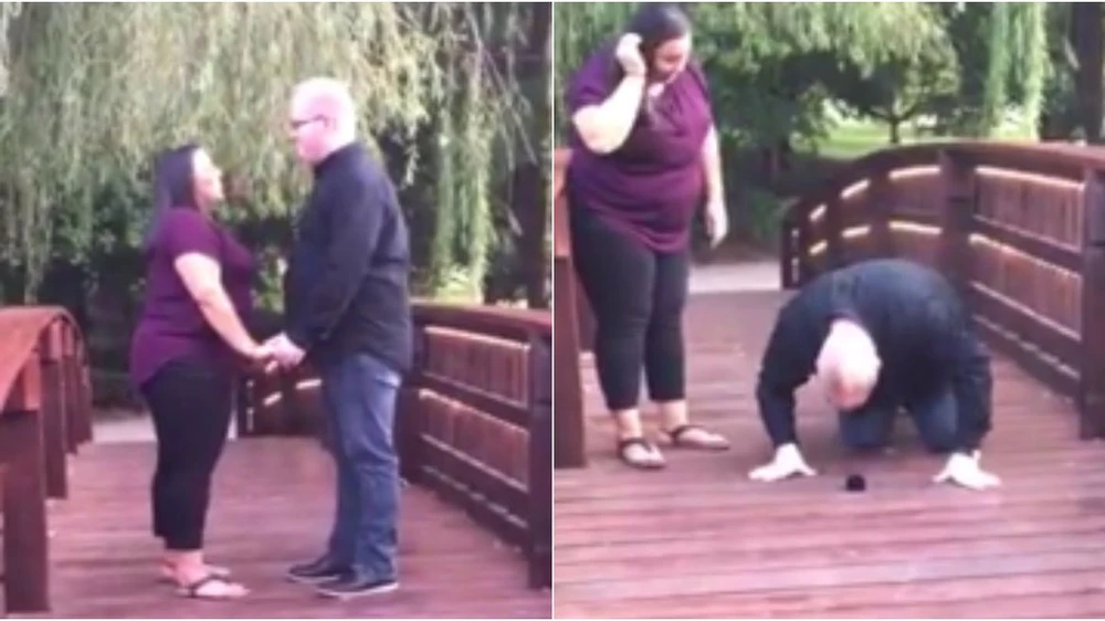 Giây phút hạnh phúc bỗng trở nên lãng xẹt khi chàng trai vô tình đánh rơi nhẫn đính hôn xuống hồ. (Ảnh cắt từ clip)