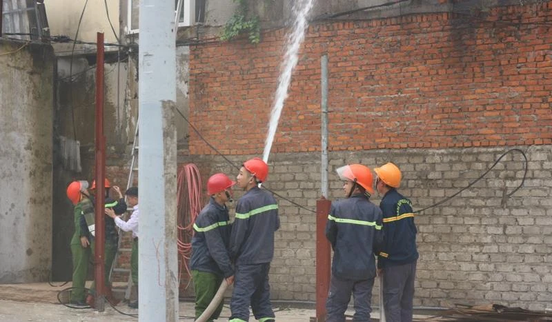 Các chiến sĩ cảnh sát đang nỗ lực chữa cháy. Địa điểm cháy gần khu Karaoke- quán Bar, Bệnh Viện Thái Thượng Hoàng và gần cả Trạm xăng dầu bên đường Nguyễn Sỹ Sách.