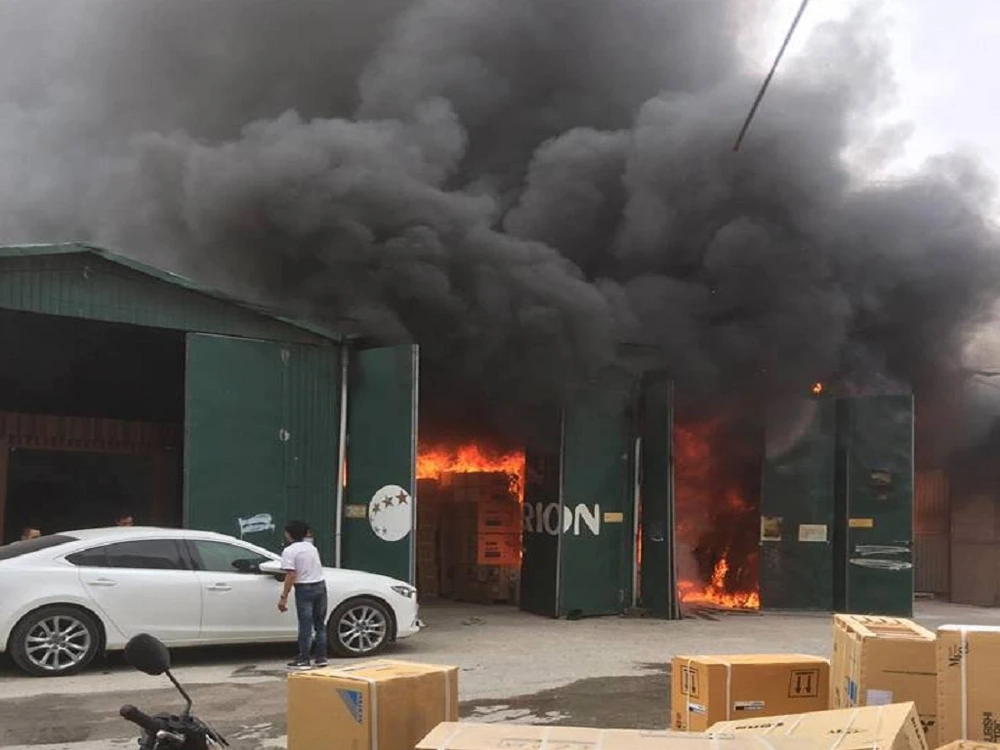 Theo một công nhân, đám cháy bắt nguồn từ kho gỗ, sau đó lan ra kho chứa điều hòa. Ngọn lửa thiêu rụi hàng hóa làm sập hai nhà kho.