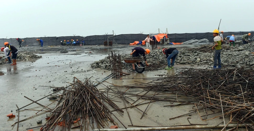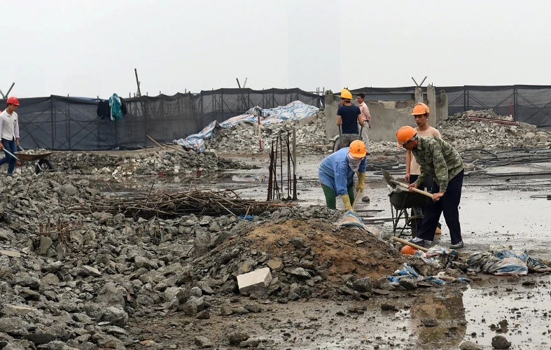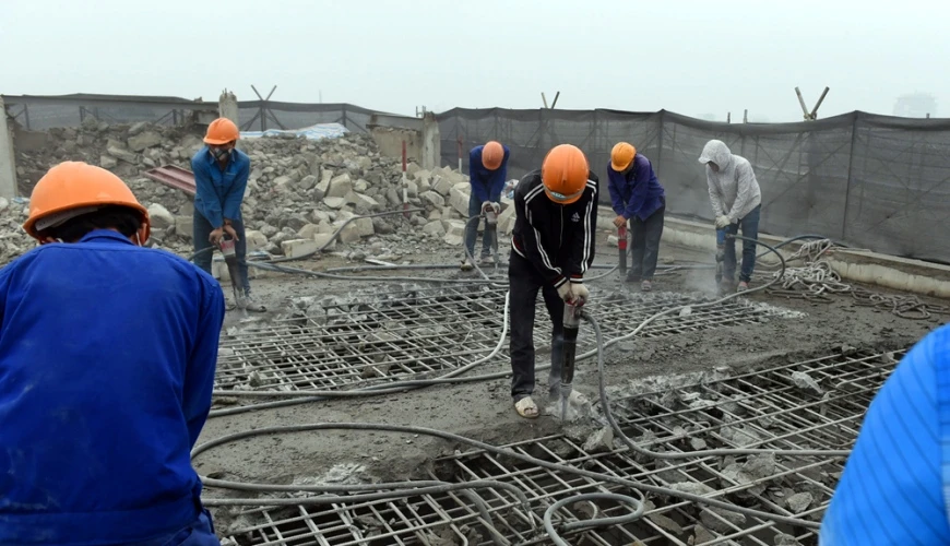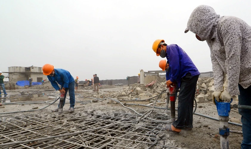 Công nhân đang làm việc, thực hiện công việc tháo dỡ dưới sự giám sát.