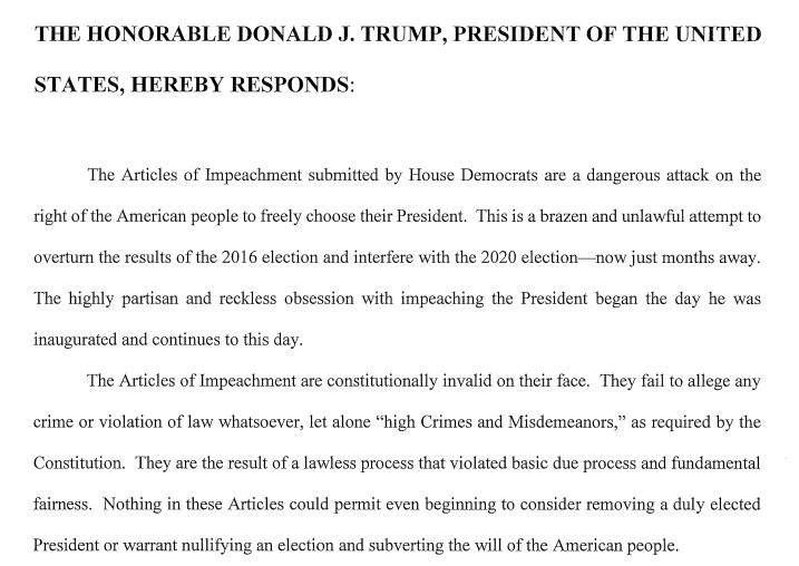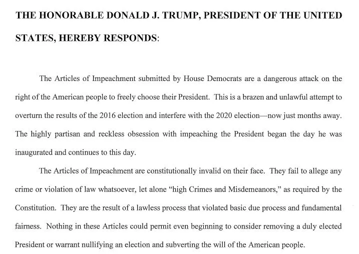 “Các cáo buộc không gì khác hơn là một nỗ lực đảng phái nhằm hạ bệ tổng thống, đó là một cuộc tấn công nguy hiểm vào quyền bầu cử chính đáng của người dân khi chọn ra một vị tổng thống” - các luật sư biện hộ của ông Trump lên tiếng.
