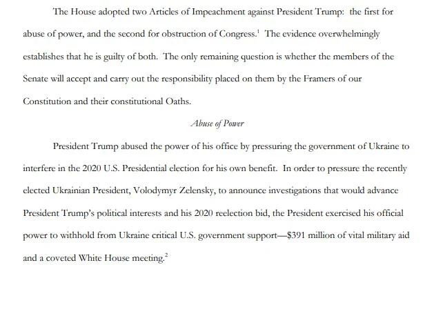 Tài liệu tranh luận đưa ra cụ thể lý do Hạ viện thông qua hai điều khoản luận tội cùng danh sách các bằng chứng rõ ràng chống lại ông chủ Nhà Trắng.