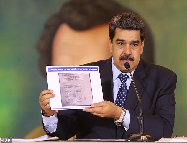 Tổng thống Venezuela Nicolas Maduro giơ bản chụp văn bản được cho là hợp đồng giữa công ty Silvercorp USA với lãnh đạo phe đối lập Juan Guaido. Ảnh: AP