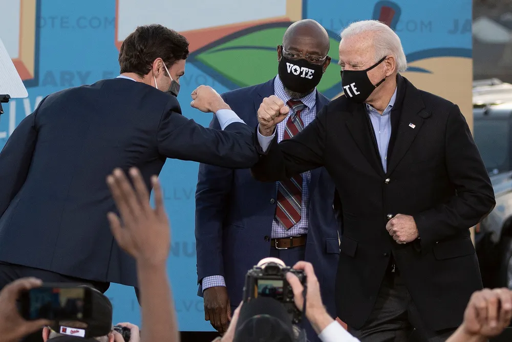 Ứng viên hượng nghị sỹ của đảng Dân chủ Jon Ossoff chạm khủy tay với Tổng thống đắc cử Joe Biden hôm 4-1. Ảnh: AFP
