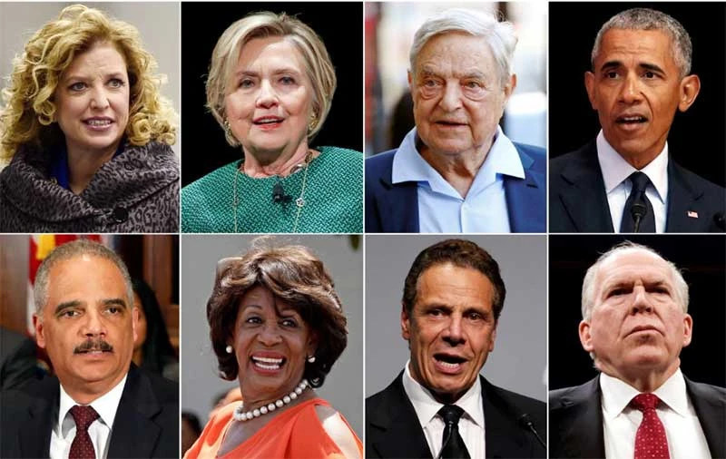 Từ trái sang: Nghị sĩ Debbie Wasserman Schultz, cựu ngoại trưởng Hillary Clinton, tỉ phú George Soros, cựu tổng thống Barack Obama, cựu bộ trưởng Tư pháp Eric Holder, nghị sĩ Maxine Waters, Thống đốc New York Andrew Cuomo, cựu giám đốc CIA John Brennan. Ảnh: REUTERS