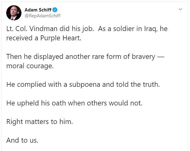 Còn nghị sĩ Dân chủ Adam Schiff, người đứng đầu nhóm công tố tại phiên tòa luận tội, đã đăng trên Twitter rằng: “Trung tá Vindman đã làm trọn công việc của mình. Từng là một người lính ở Iraq, ông ấy nhận được "Trái tim màu tím". Sau đó ông đã thể hiện sự dũng cảm, gan dạ khi tuân thủ trát hầu tòa và nói ra sự thật. Ông ấy đã giữ lời thề, còn những người khác thì không”.