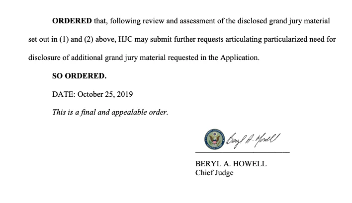 Theo AP, bà Beryl Howell, Chánh án tòa án liên bang tại Washington D.C, đã ra phán quyết khẳng định tính hợp pháp của yêu cầu luận tội, cũng như yêu cầu Bộ Tư pháp Mỹ phải giao nộp nguyên văn báo cáo điều tra của Công tố viên đặc biệt Robert Mueller về cáo buộc Nga thao túng bầu cử Mỹ 2016.
