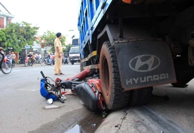 Tại hiện trường, thi thể nạn nhân nằm dưới gốc cây trên vỉa hè. Cách đó không xa là chiếc xe máy đang nằm gọn dưới bánh sau của xe tải. Đến 17h 30 cùng ngày, hiện trường vụ tai nạn đã được giải quyết xong.
