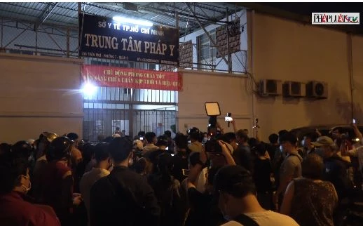 Rất đông đồng nghiệp, người ái mộ đứng bên ngoài Trung tâm Pháp y nơi đặt thi hài nghệ sĩ Chí Tài. Ảnh: Cắt từ clip PLO.